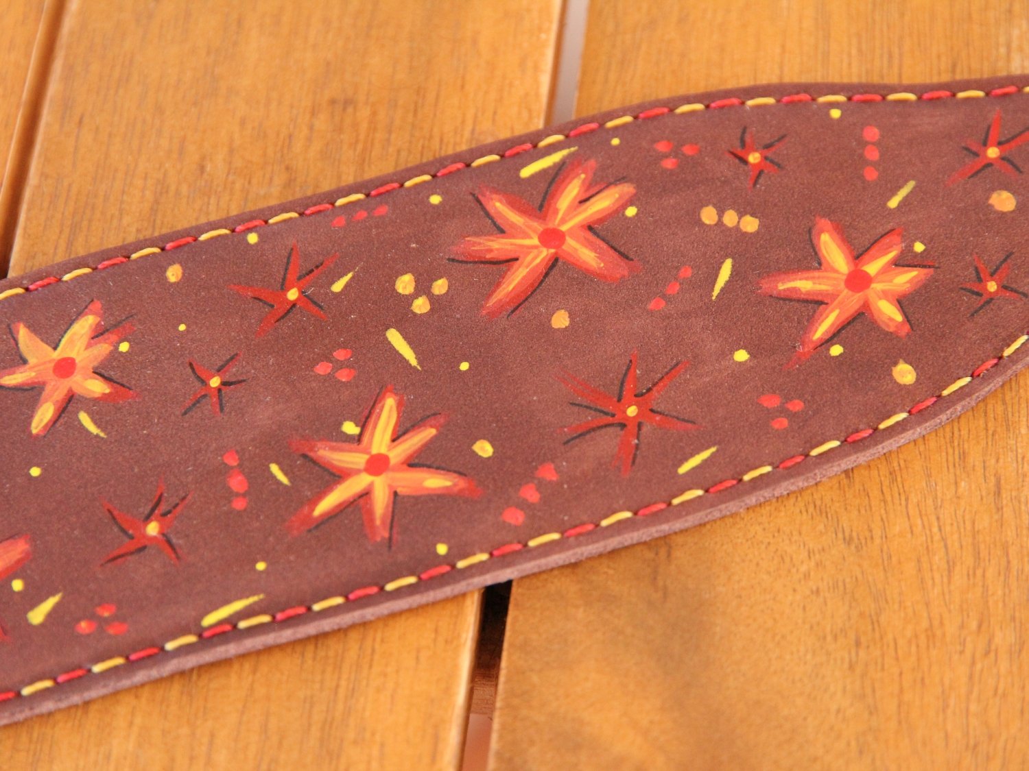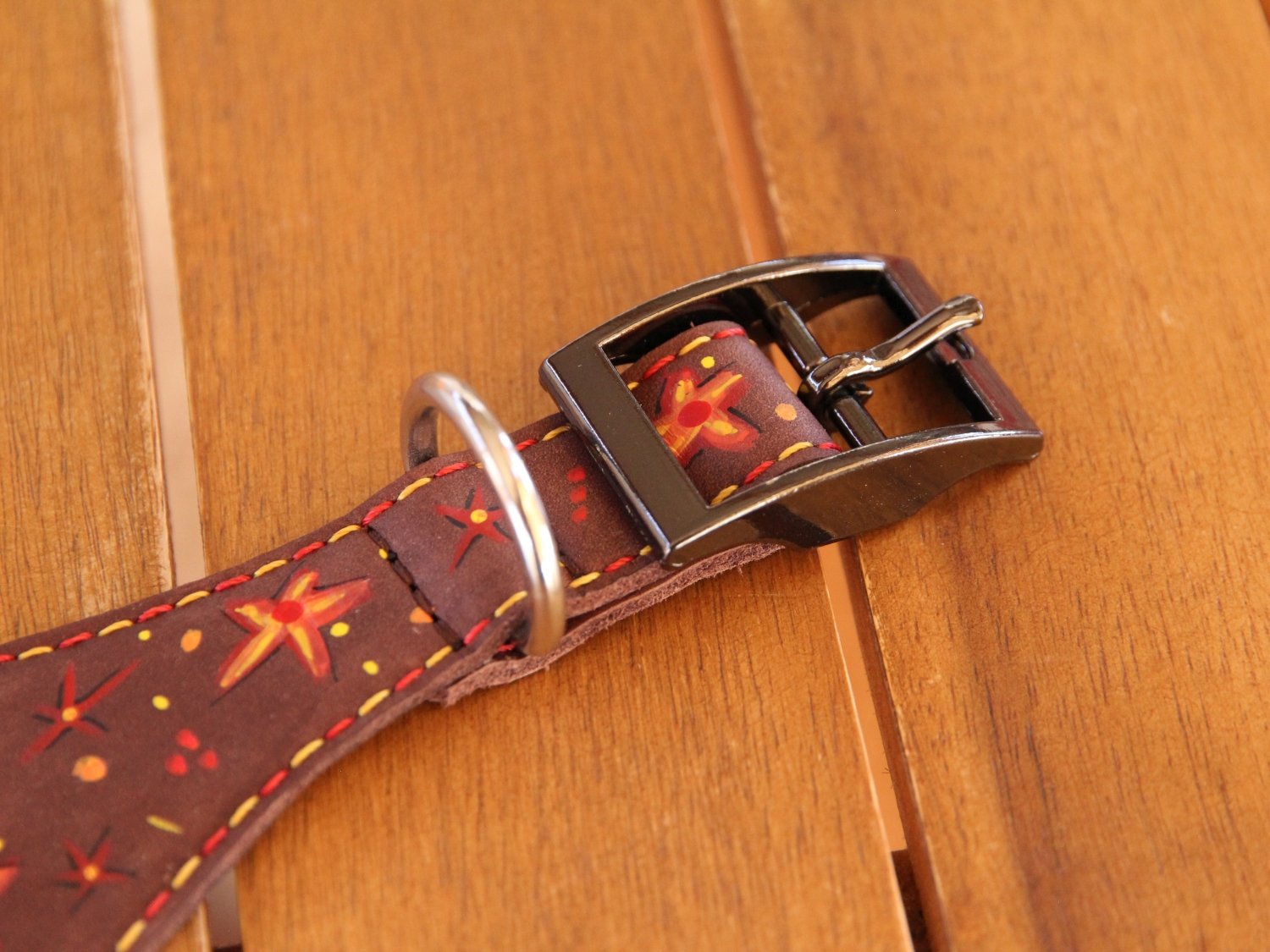 Das Halsband ist bunt bemalt mit Punkten und Sternen in gelb, orange und rot.