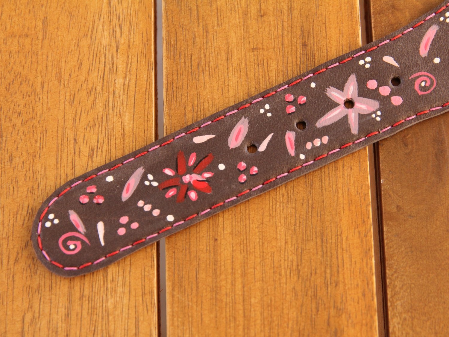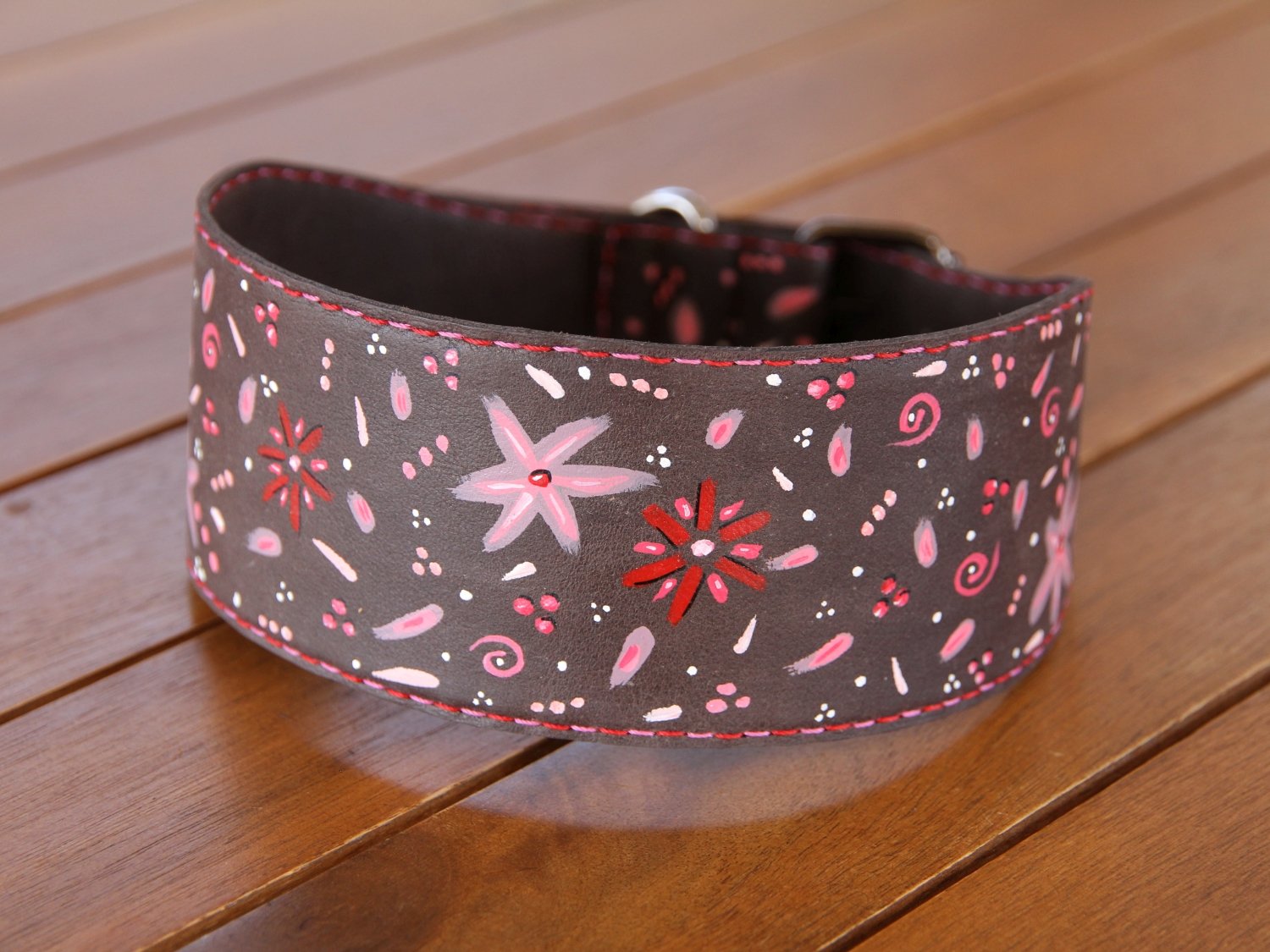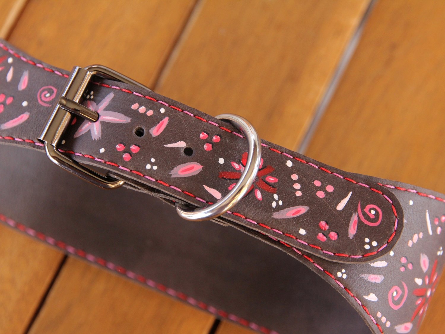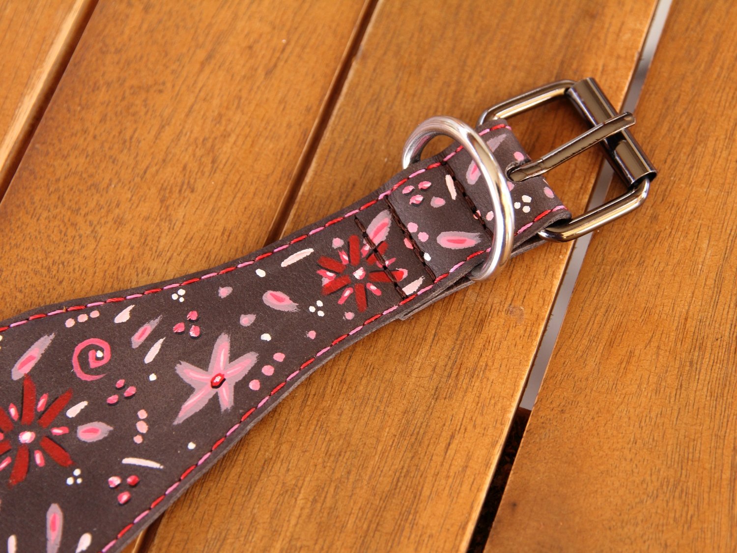 Das Halsband ist bunt bemalt mit Symbolen, Punkten und Sterne in rot bis hellrosa.