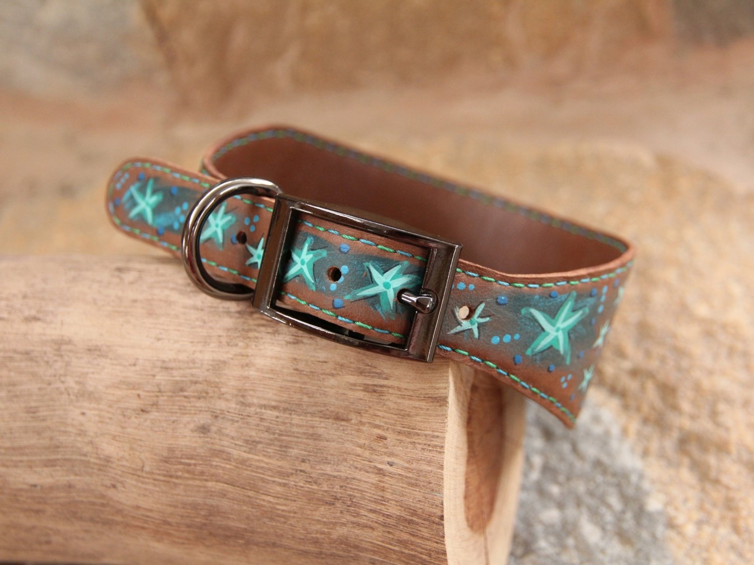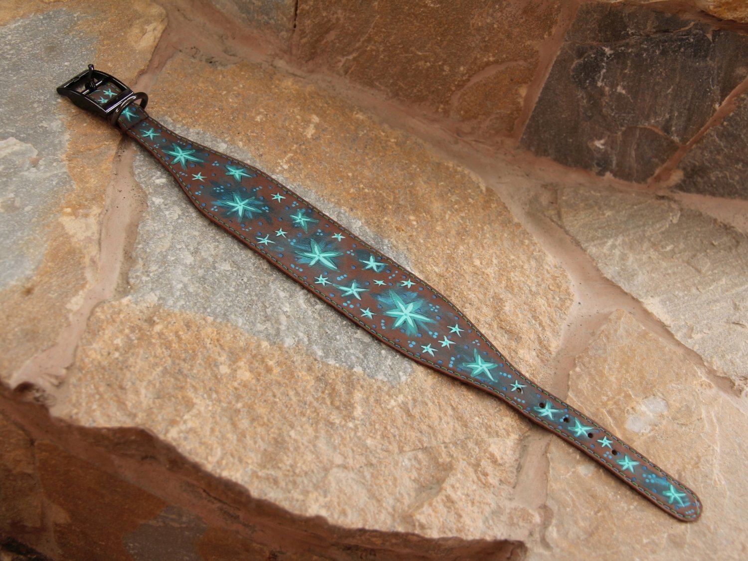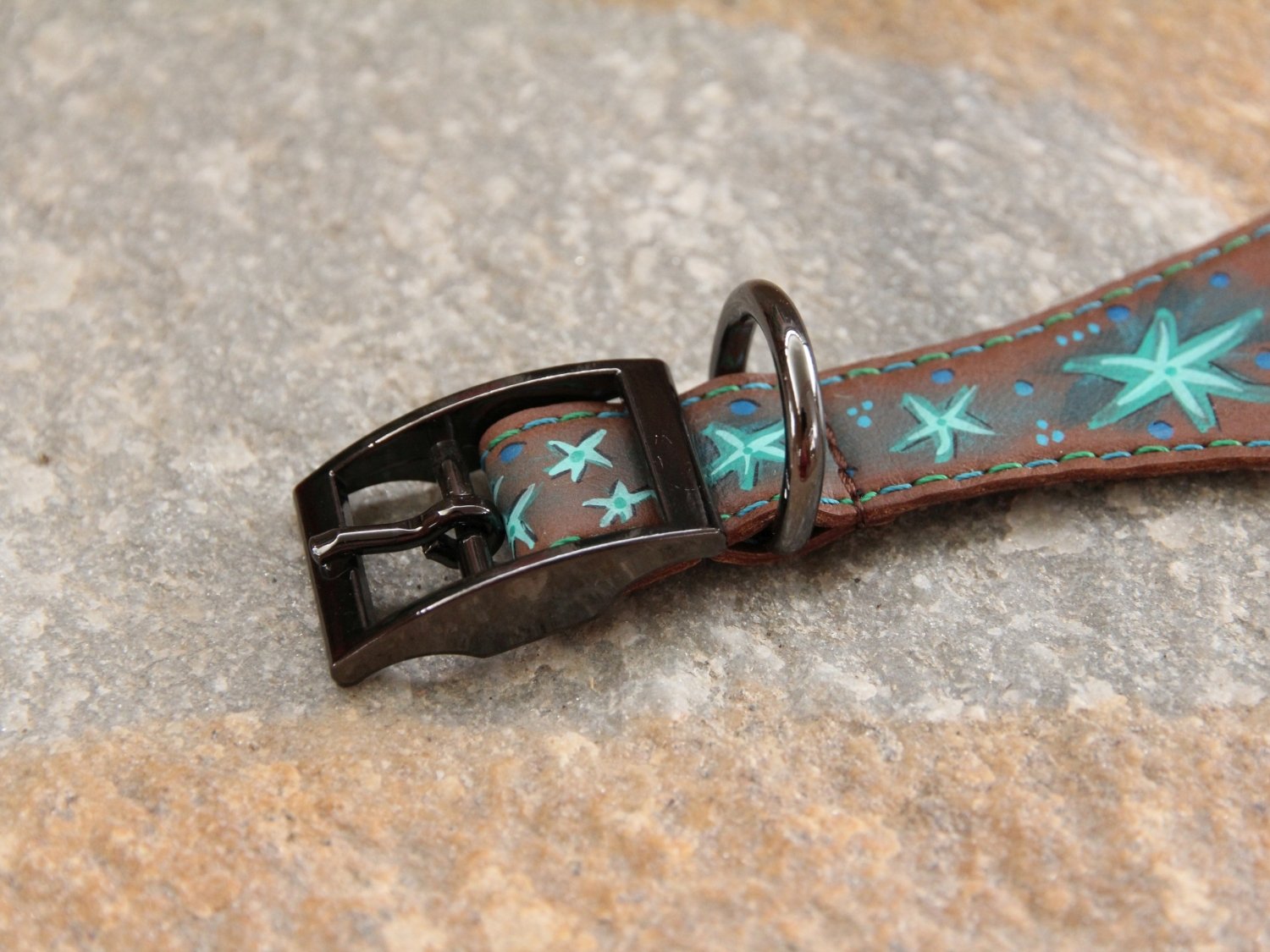 Das Halsband ist bemalt mit grünen/mintgrünen Sternen und hat hellblaue/blaue Punkte.