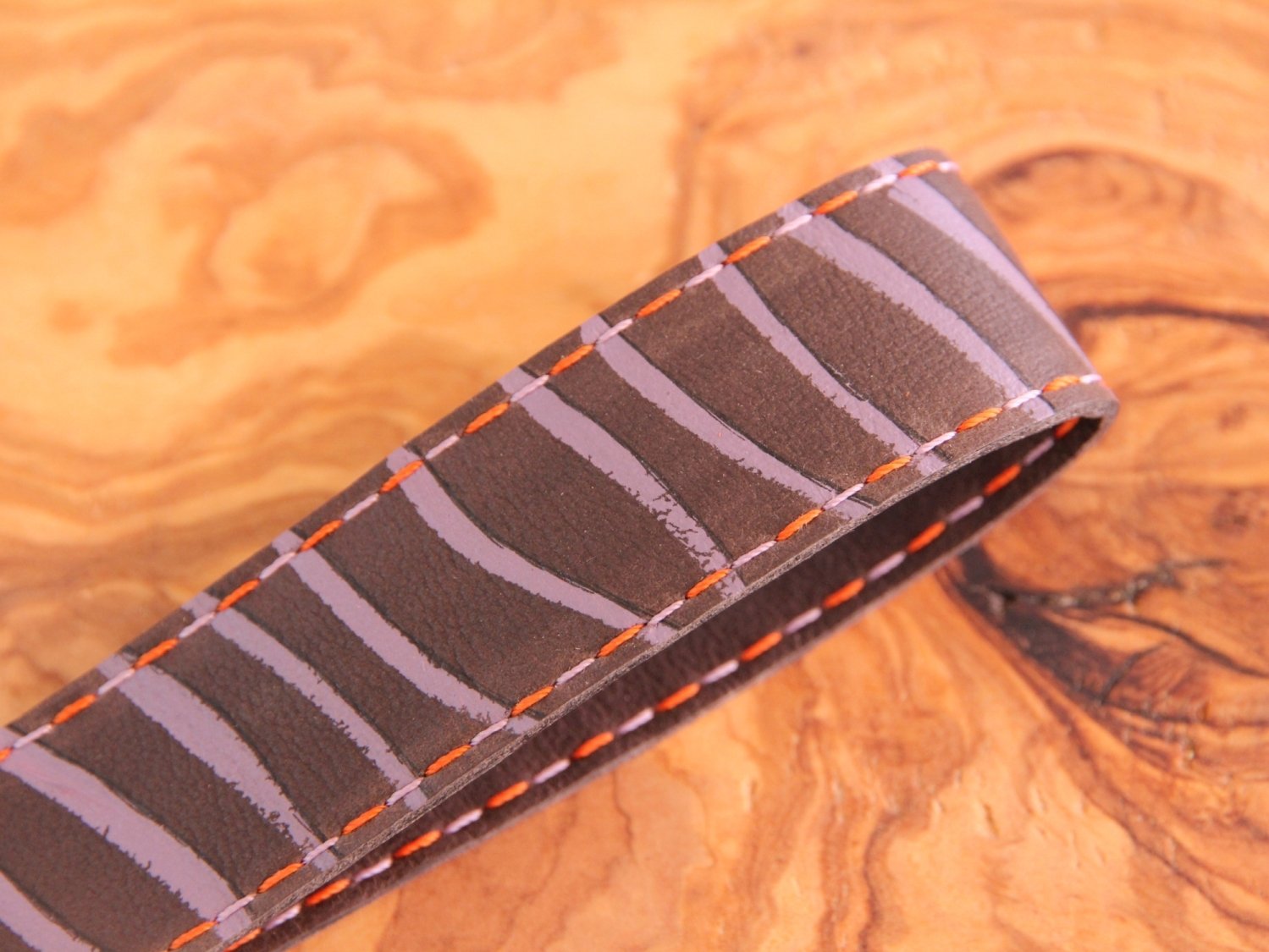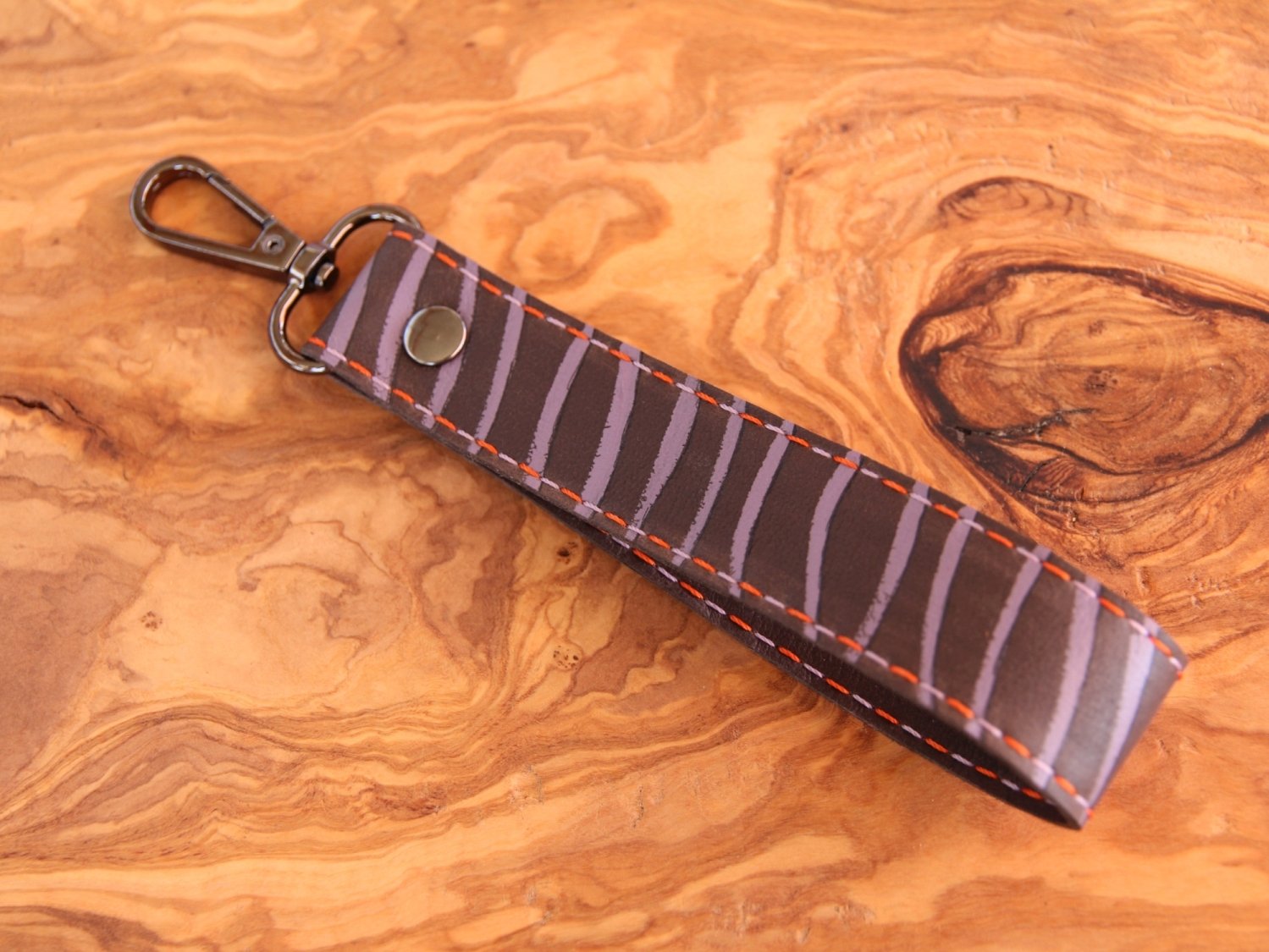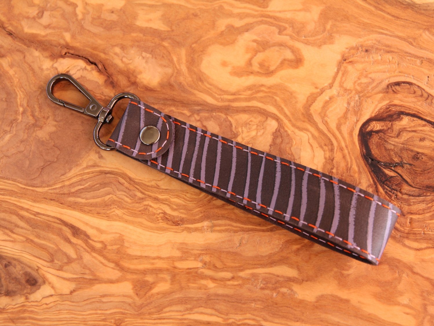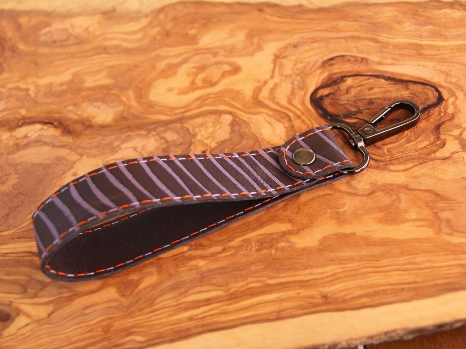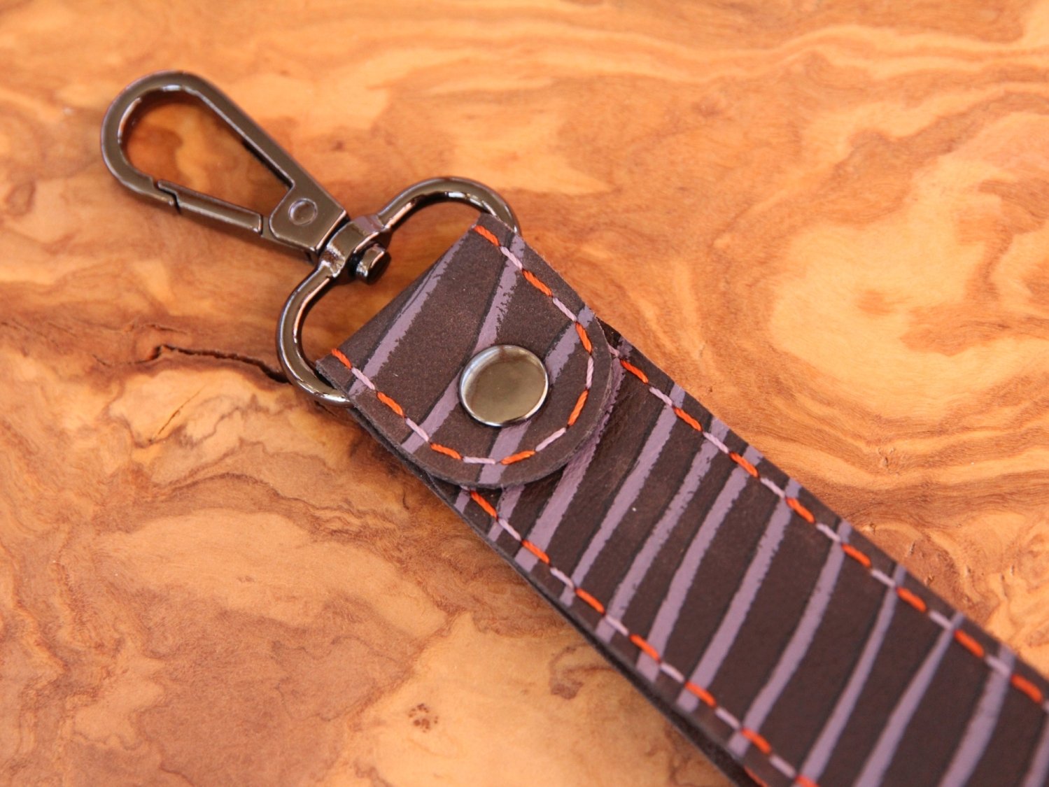 Der Schlüsselhalter ist bemalt mit Streifen in flieder.
