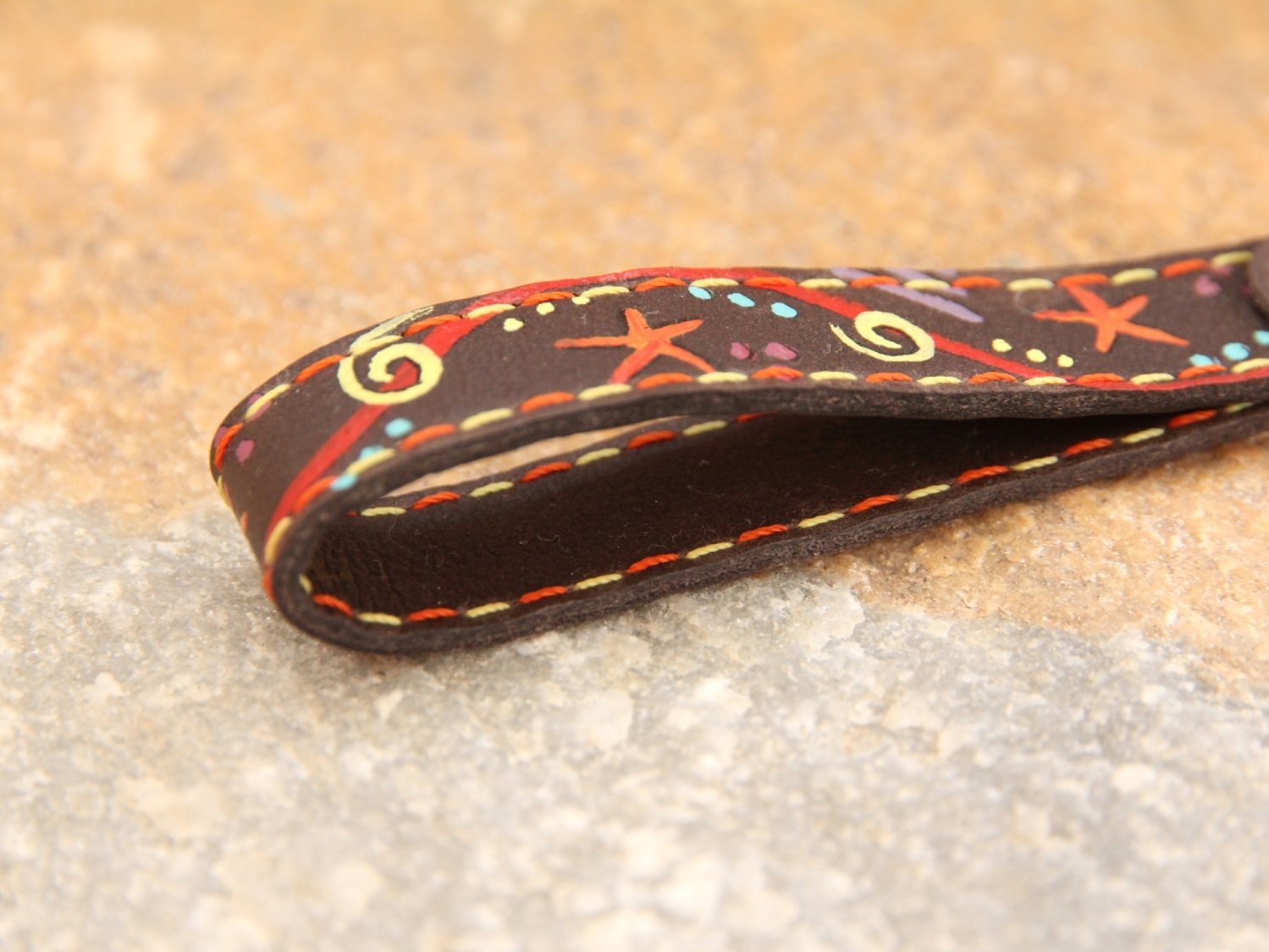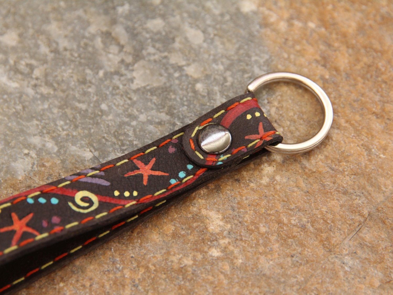 Der Schlüsselanhänger ist bunt bemalt mit Streifen, Kringel und Punkten in verschiedenen Farben.