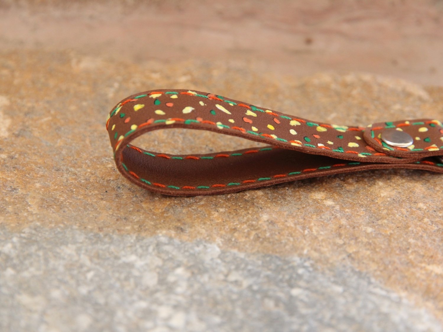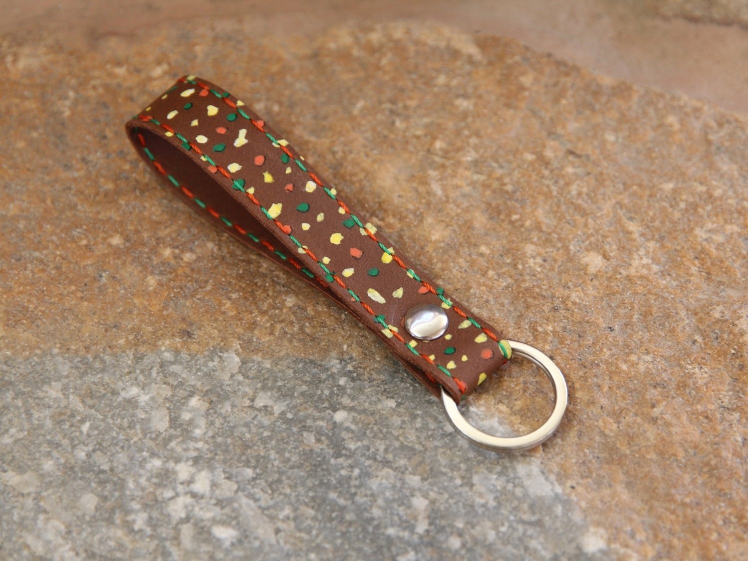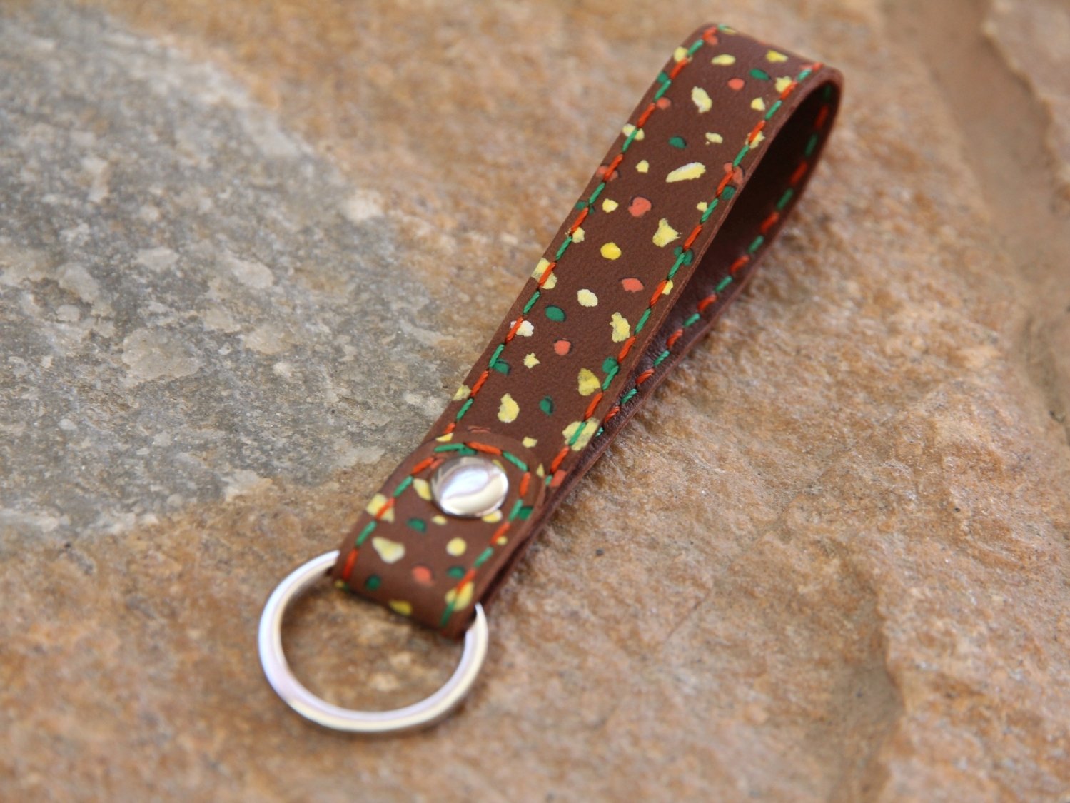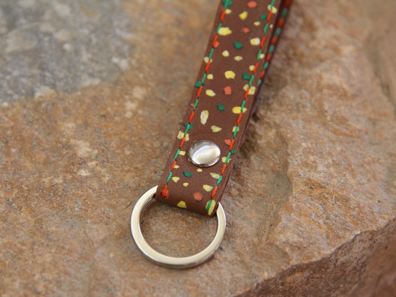 Der Schlüsselanhänger ist bemalt mit vielen Punkten in grün, orange und gelb.
