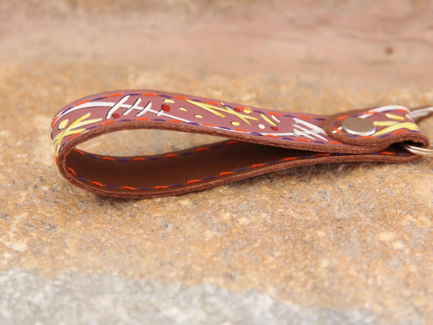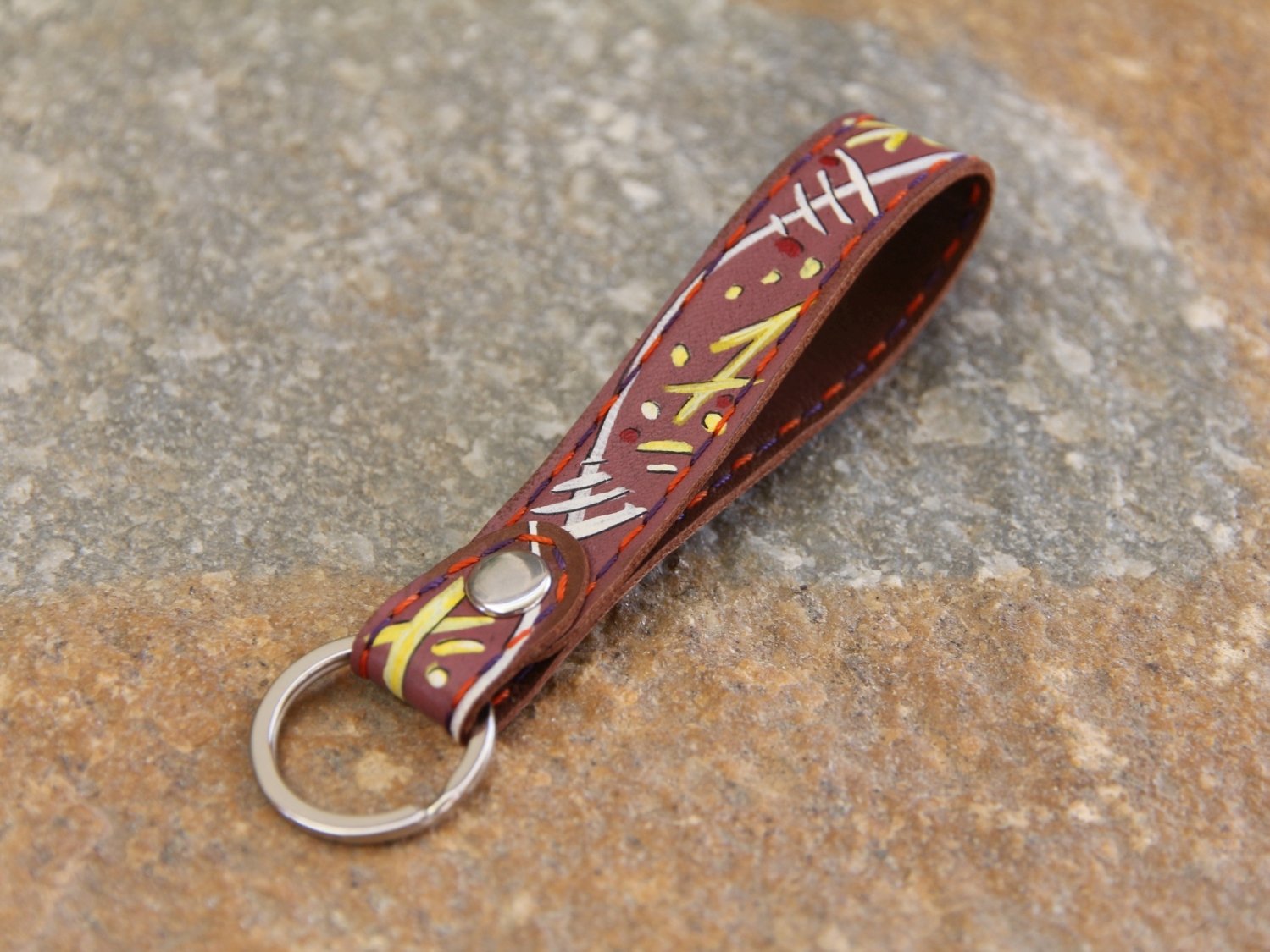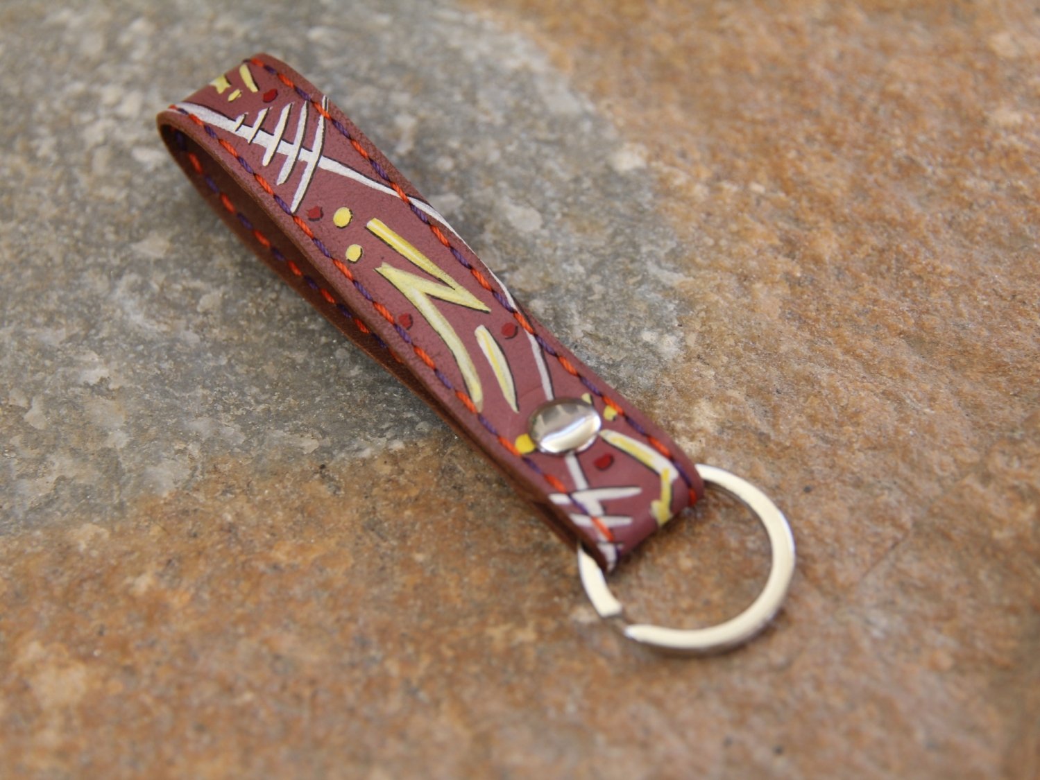 Der Schlüsselanhänger ist bemalt mit Linien und Punkten in weiß, hellgelb und rot.