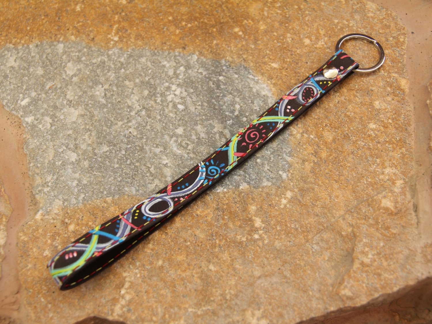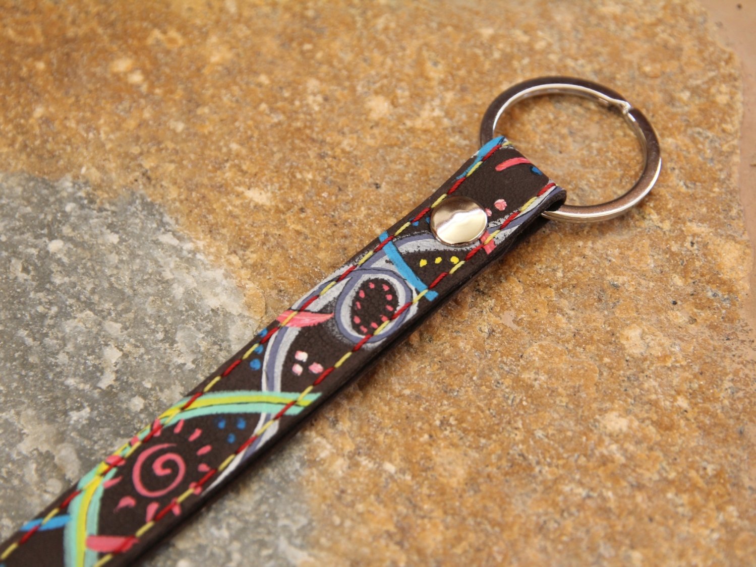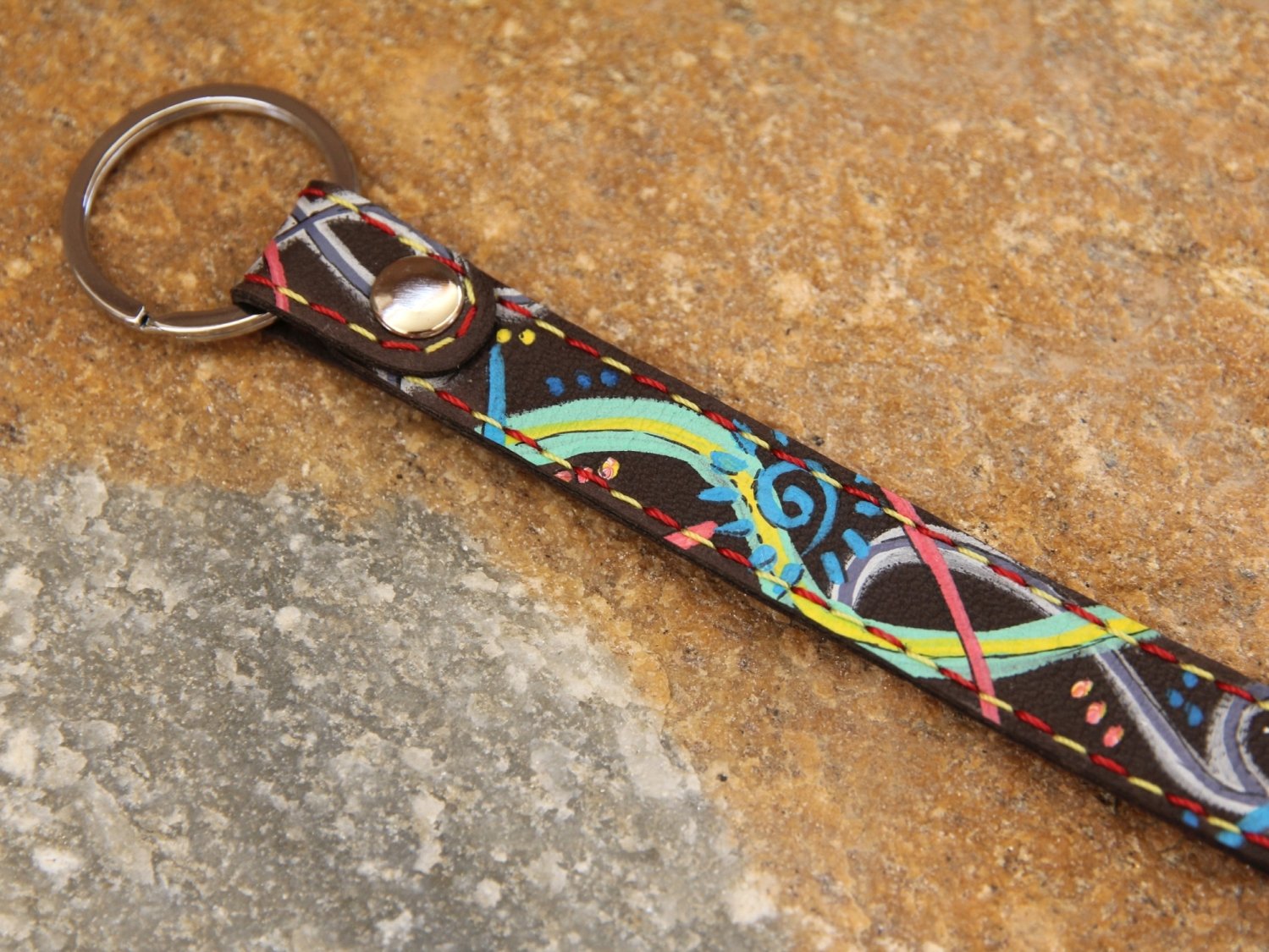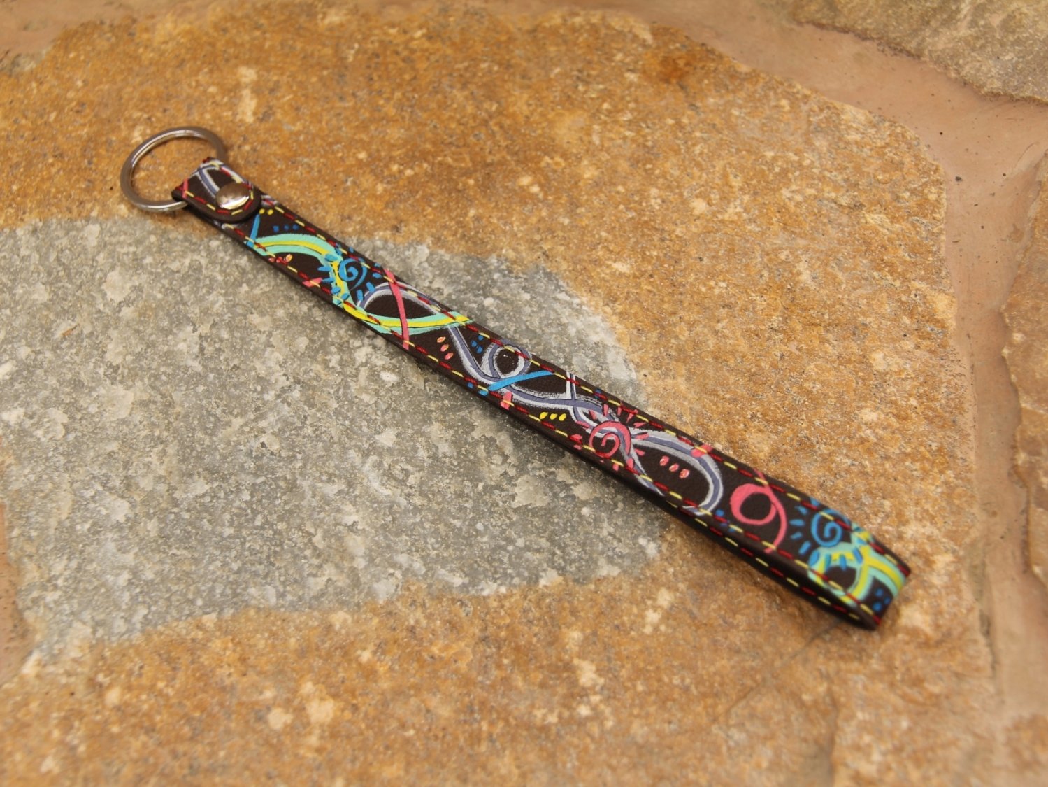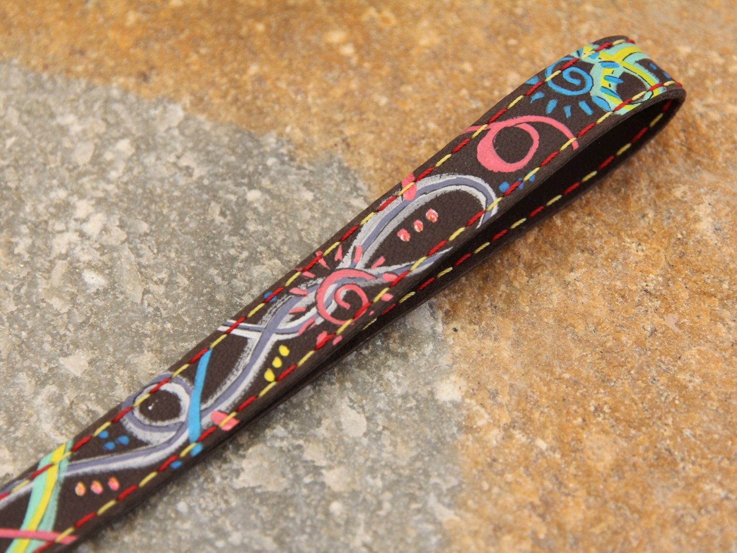 Das Schlüsselband ist bunt bemalt mit allerlei Symbolen und Kringeln in vielen verschiedenen Farben.