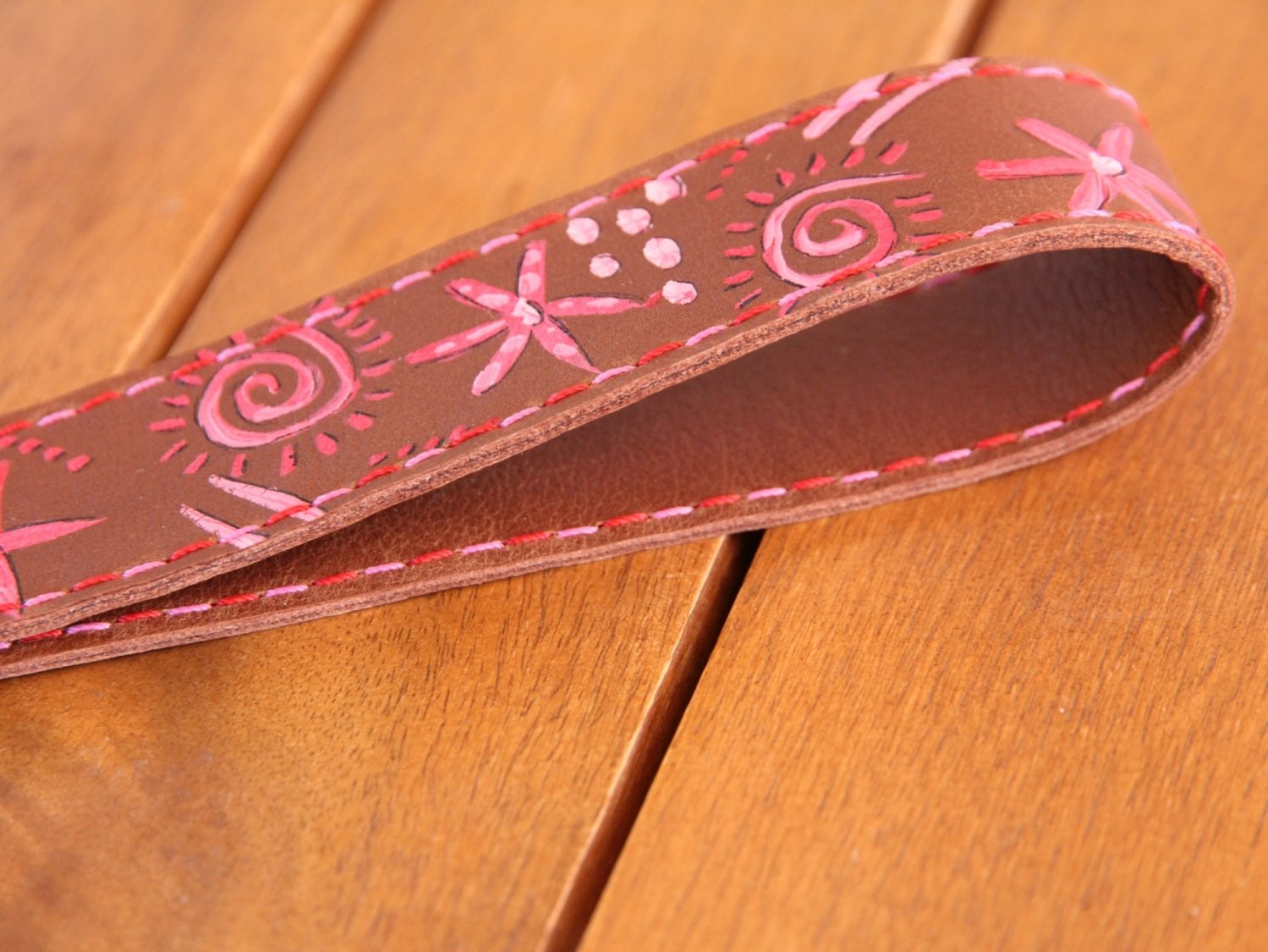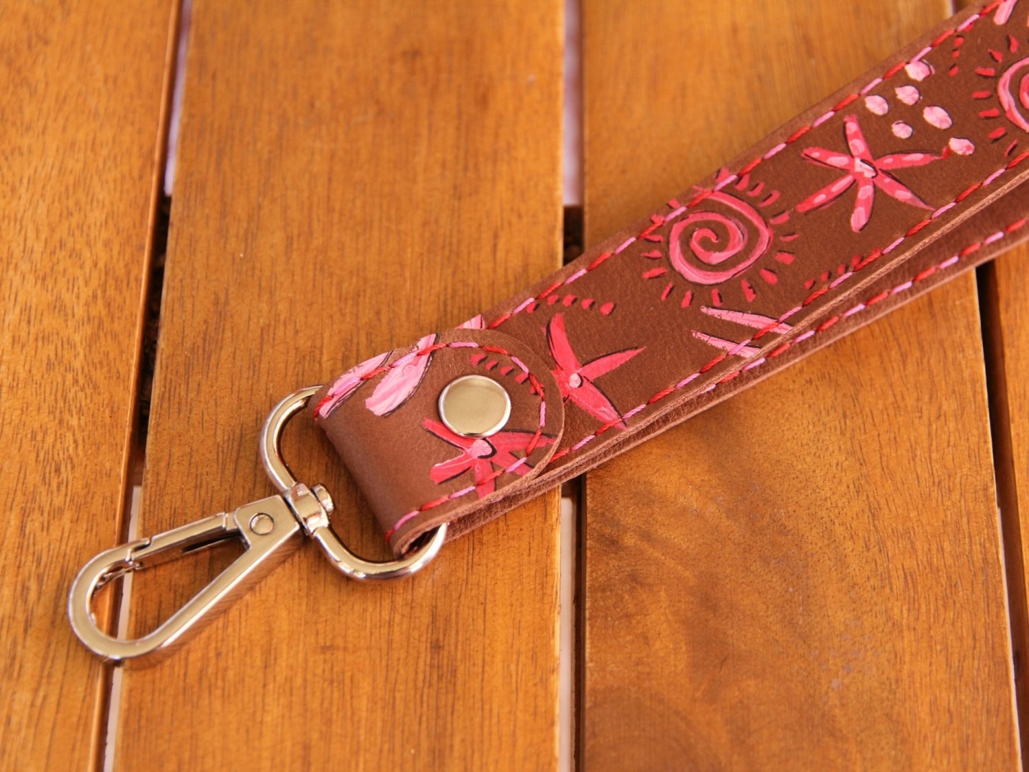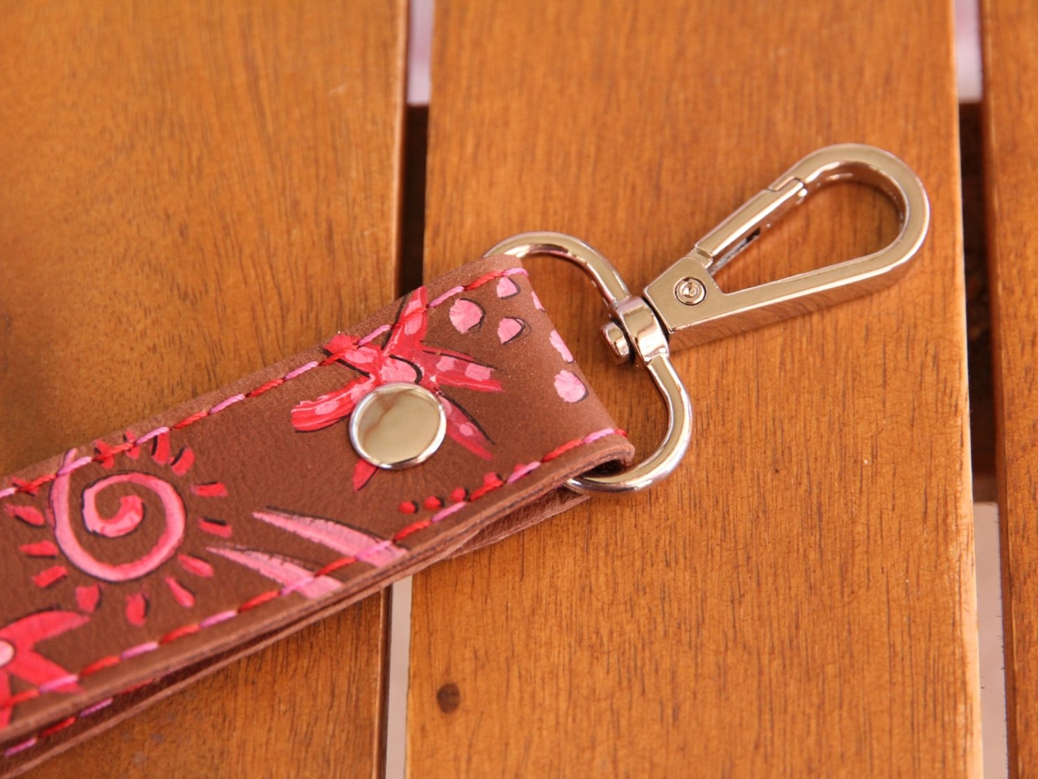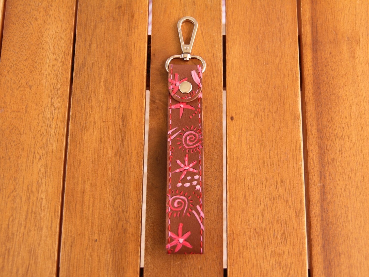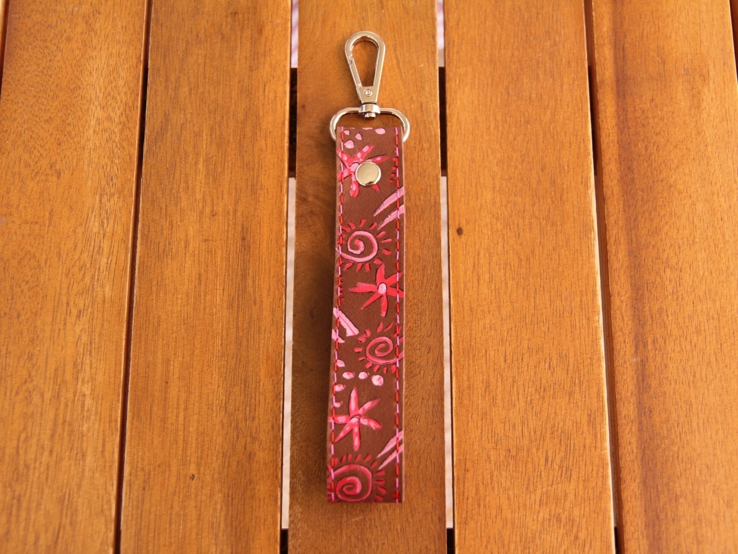 Der Schlüsselhalter ist bemalt mit verschiedenen Symbolen in rot und rosa.